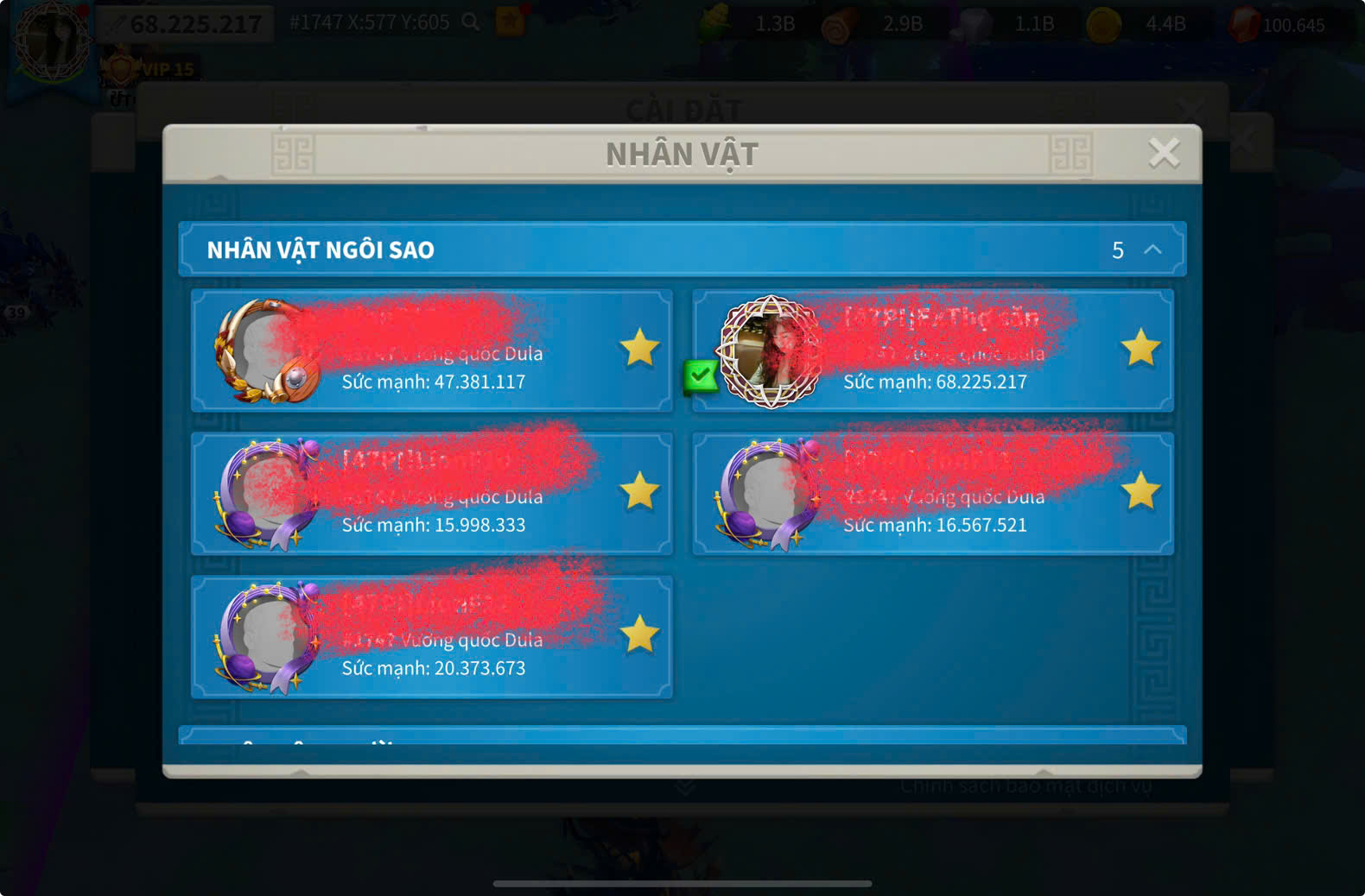 Acc Vip 15 max 8 cam ủ tăng tốc + dư 1300 trọc + đủ vé + kẹp 4 acc phụ + acc phụ vip 15 kẹp 5 cam dư 1800 trọc