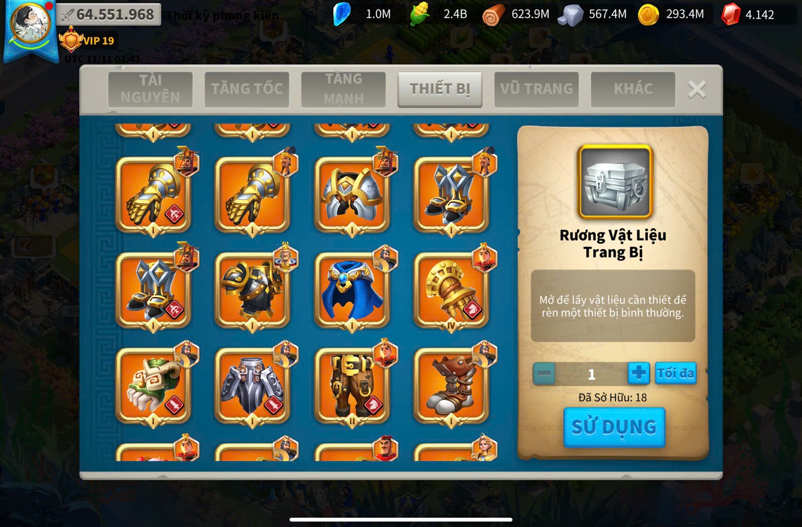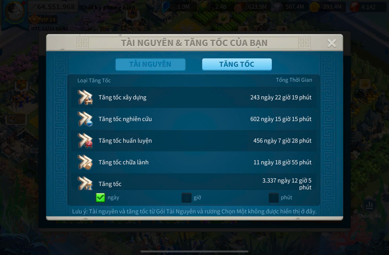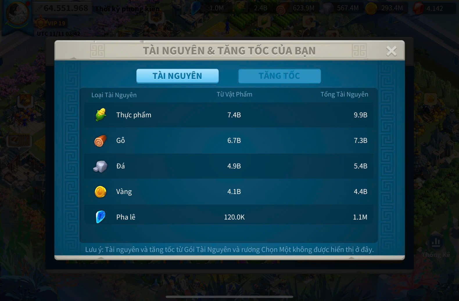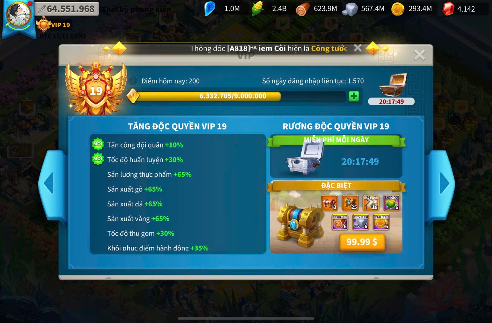 Acc Vip 19 Bản Quốc Tế - 30 talen dư 100 ngày gem + 103 ngày nguyên liệu + 3800 ngày tăng tốc - 22 tỷ rss kho